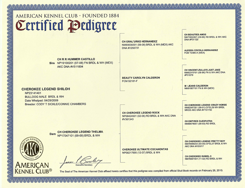 Shiloh is a son of International Champion RR Hummer Castillo. His Mom, Champion Cherokee Legend Thelma is a top winning female with multiple best of breeds. She was a champion producer.